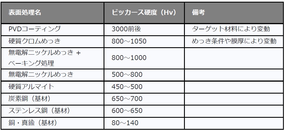 この硬度比較表からは、PVDコーティングや硬質クロムめっきが基材を遥かに上回る硬度を付与することが一目でわかります。
